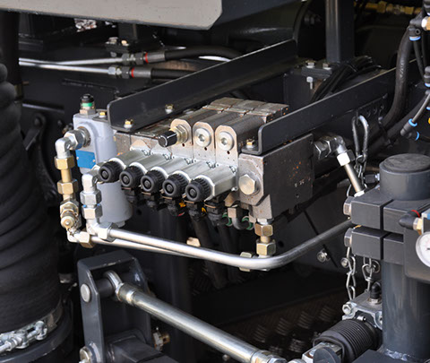Die Steuerung aller Funktionen der Kehrhydraulik findet über elektromagnetische Ventile vom Bedienpult im Fahrerhaus statt.